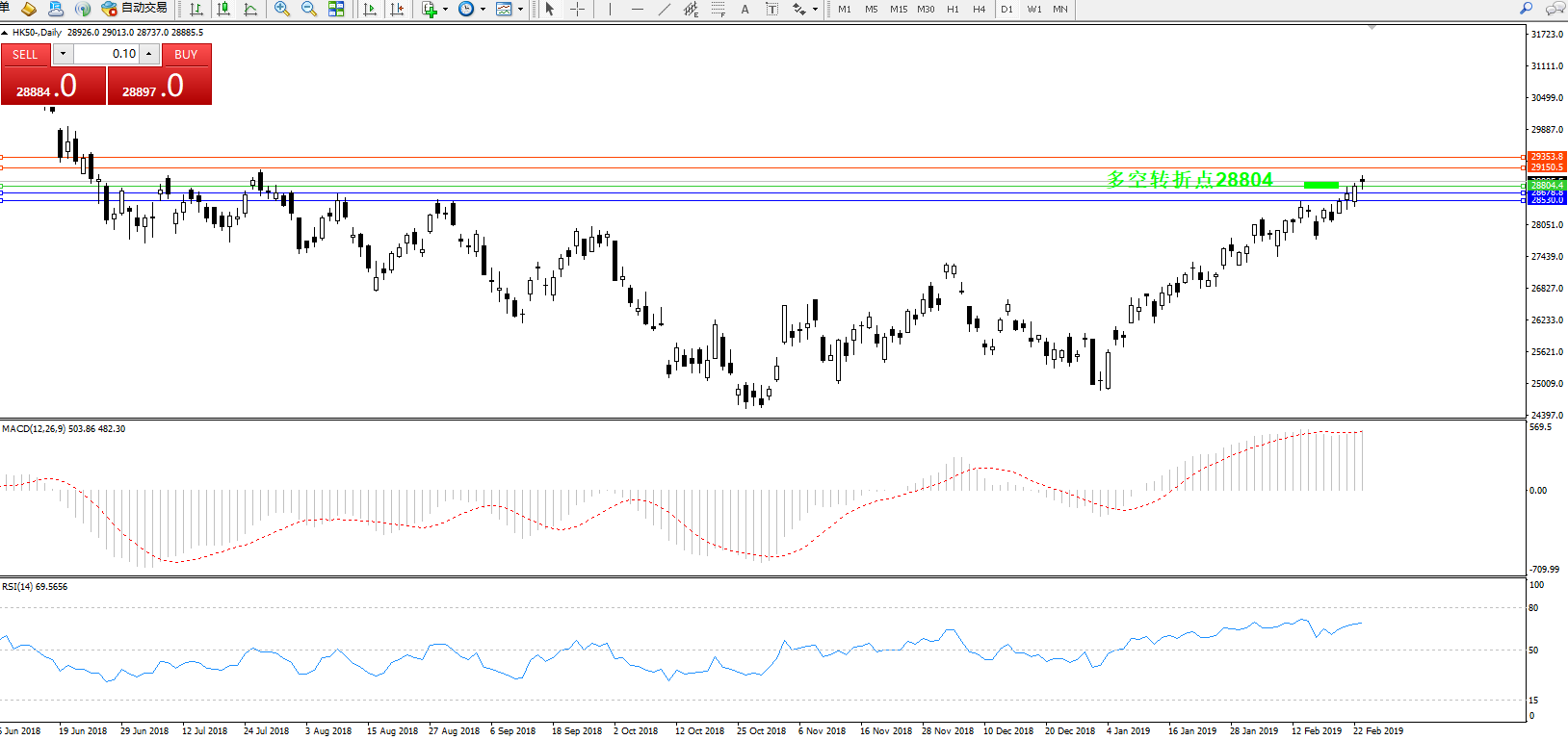 亚洲股市全线上涨,中国内地股市飙涨,沪深两市高开高走,涨幅均超5%,成交额达10406亿元,创2016年以来新高,也是继2015年以来首次达到万亿大关,香港恒生指数高开后在平盘线上方震荡,盘中一度突破29000点,截至收盘小幅上涨,报28959点。并推动亚洲其他市场走高。中美贸易谈判接连传出好消息,据央视新闻报道,美国当地时间2月24日下午,第七轮中美经贸高级别磋商在美国首都华盛顿结束。美国总统特朗普表示,磋商取得实质性进展,美国将延后原定于3月1日对中国产品加征关税的措施。