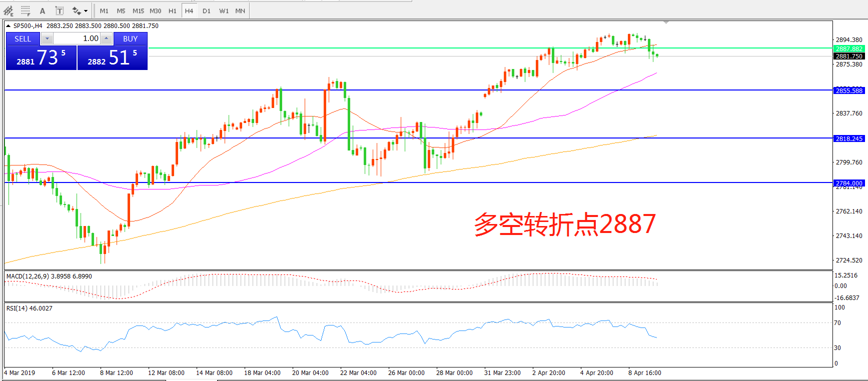 4小时图看,标普500连续上行后出现回落,短期支撑看向下方55周期均线, MACD红柱缩短,RSI指标走平,日内以震荡思路对待。