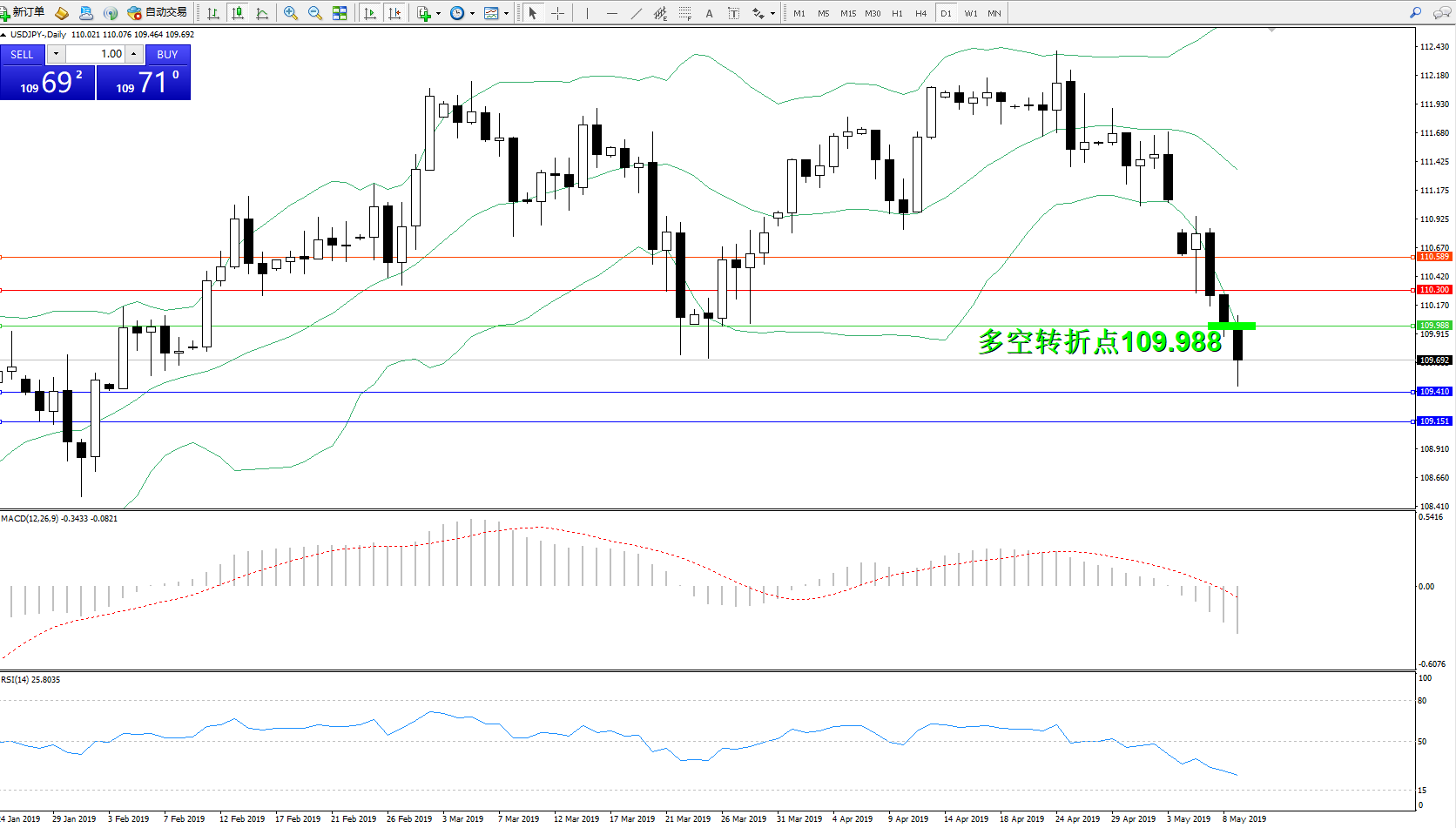 美元兑日元处于下跌趋势,因风险厌恶一直是本周的主题,全球贸易紧张局势不断升级,全球股市再度下行,东北亚局势也在升温,而英国工党科尔宾表示,跨党派脱欧谈判没有取得任何进展,这些令资金转向避险资产,日元因此受益。此前日本消费者信心指数好于预期,但与上个月相比有所下降,4月份为40.4。总体而言,考虑到避险情绪,市场仍将目标锁定在108.50/60区域,预计会进一步下跌。