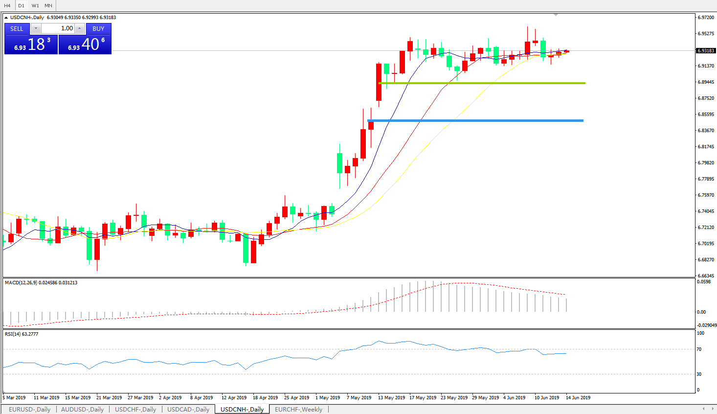 技术面简析:日线图均线粘合呈宽幅整理态势,MACD在0轴上方运行但动能柱持续缩量,RSI下穿超卖区域后走平,汇价延续整理态势,预计短期汇价有整理回落需求,中期重点关注中美贸易争端后续进展。
