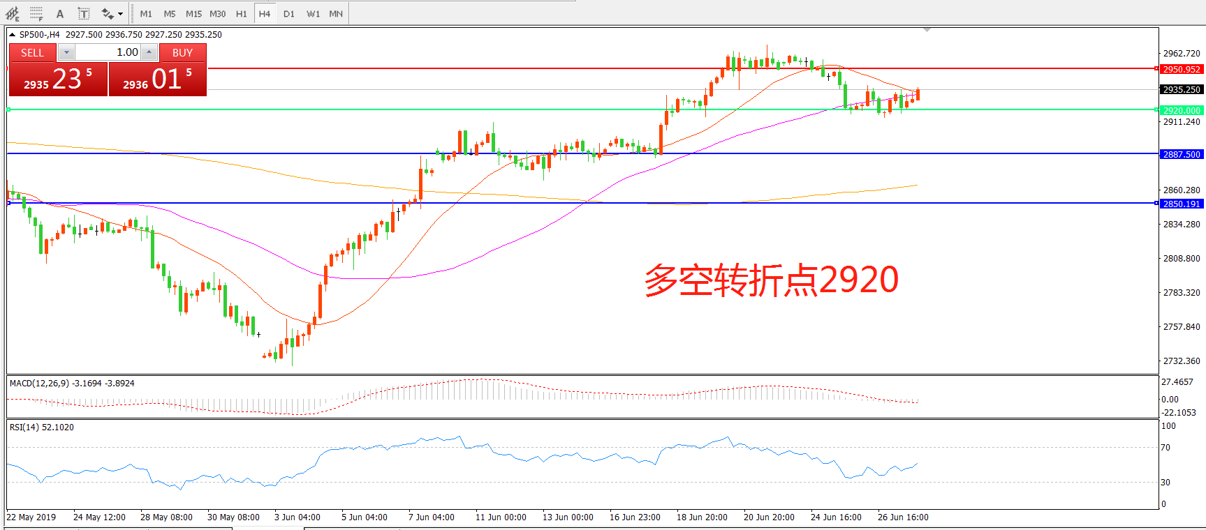 4小时图看,标普呈现高位震荡走势,2920成为短线支撑,均线系统逐渐粘合,MACD红柱增加,RSI指标向上,日内延续震荡概率较大。
