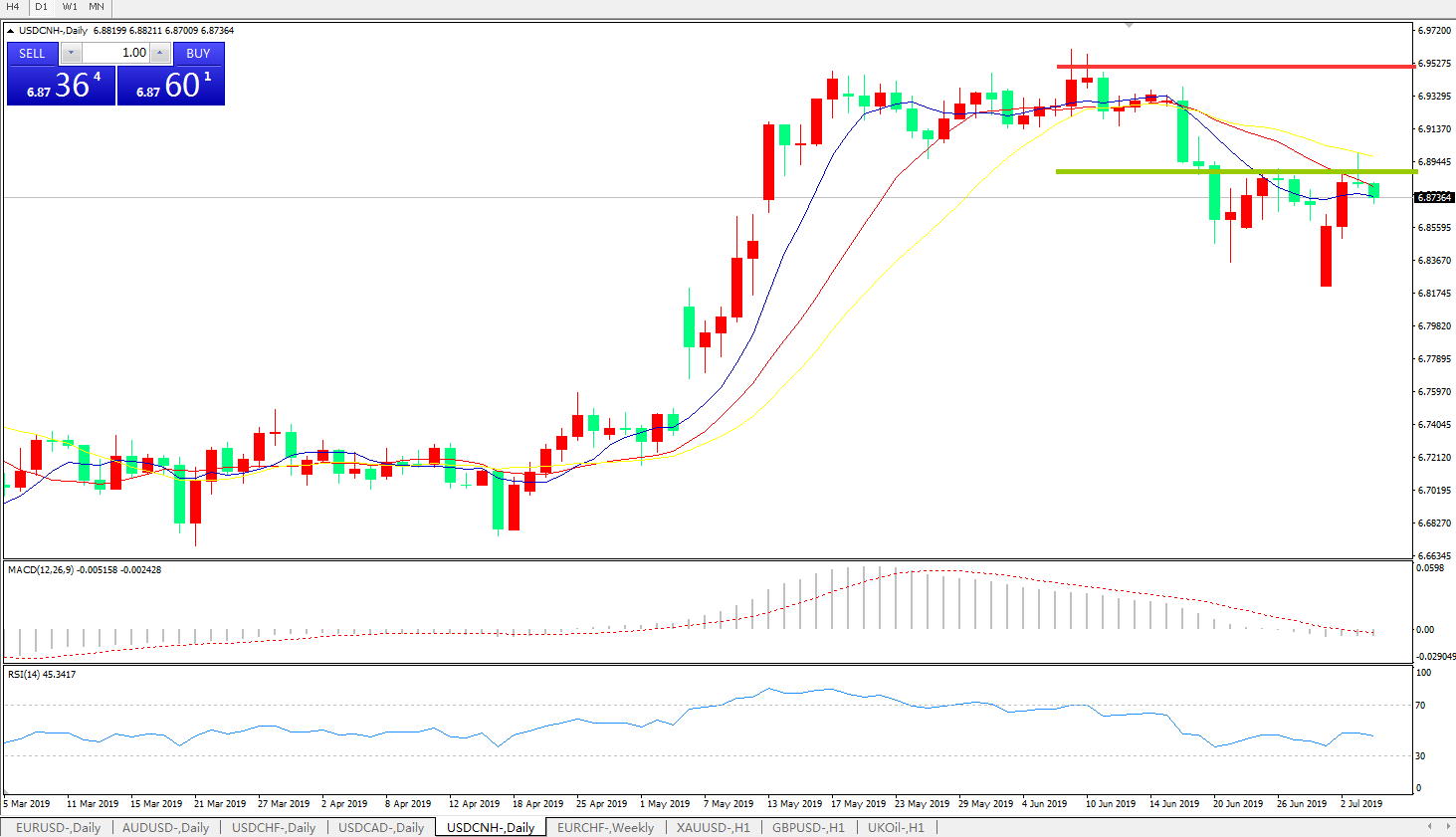 交易策略6.9000之下,看跌,目标价位为6.8100,然后为6.7600