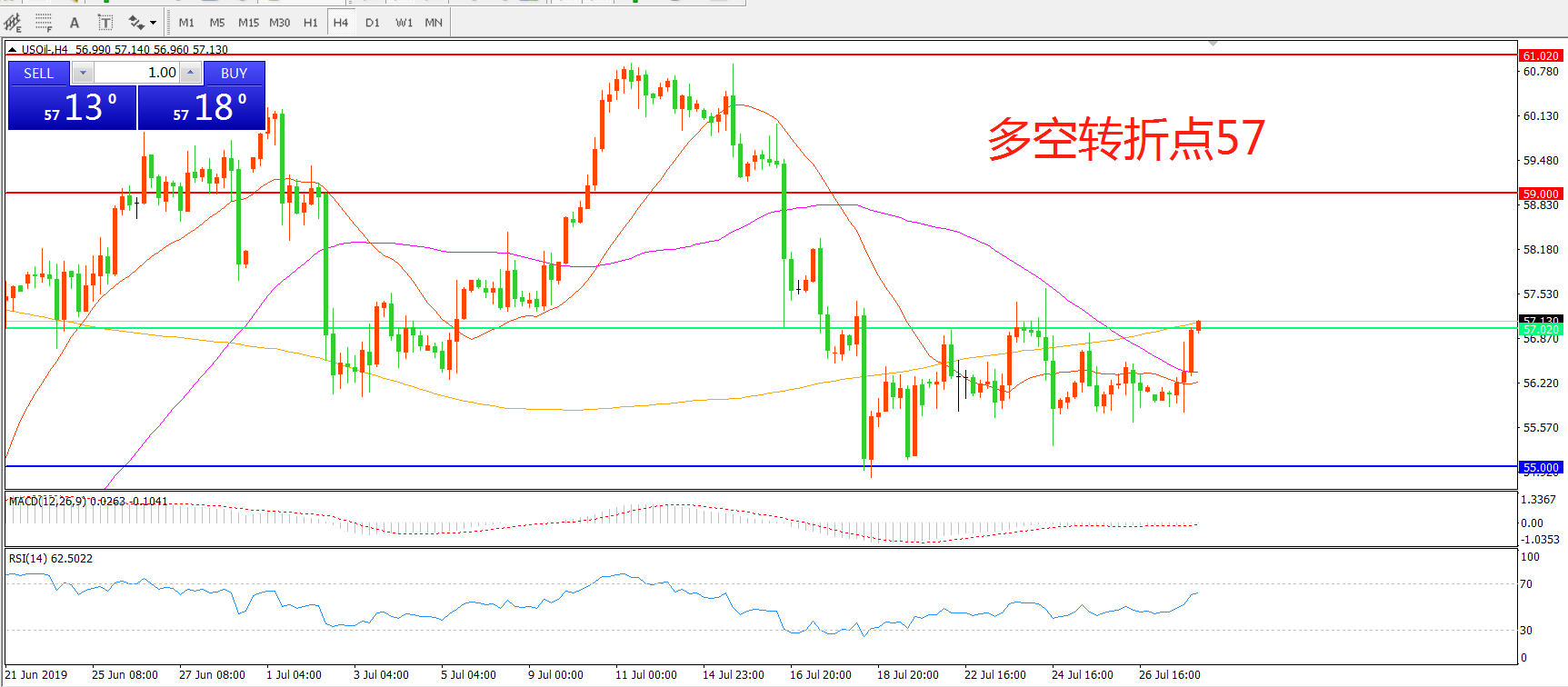 随着消费支出的增加,美国经济增长在第二季度放缓低于预期,但全球贸易的担忧情绪依然还在延续,中美代表团准备进行新一轮谈判令原油多头信心受到鼓舞,原油价格小幅攀升, 美国WTI原油周一(7月29日)收涨1.2%,报57.16美元/桶,美联储议息会议前,市场观望氛围较浓。
