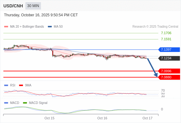 备选策略: 如突破 7.1397 ,USD/CNH 目标方向为 7.1591 和 7.1706 。