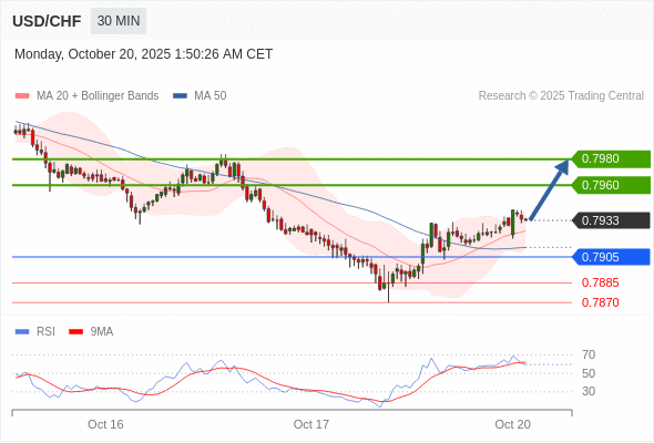 在 0.7905 之上,看涨,目标价位为 0.7960 ,然后为 0.7980 。