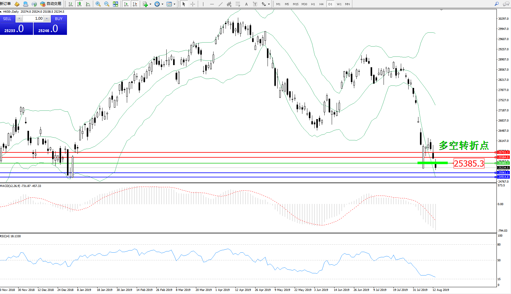 香港恒生指数8月13日(周二)收盘下跌543.42点,跌幅2.10%,报25281.30点;恒指跟随外围大幅低开,曾收窄跌幅至跌208点。空头压力强劲,随后更扩大跌幅,最多跌458点,恒指低见25366。内地公布金融数据再差于预期,恒指实难独善其身而逆市造好,唯有跟随向下。并逐步迫近25000关口,美国7月份消费者价格普遍上涨,但通胀率的上升可能不会改变人们对美联储(fed)下月将再次降息的预期;金融市场已完全消化了美联储9月降息的预期;贸易紧张局势的最新加剧和全球经济增长放缓正在给前景带来压力,投资者预计年底前还会有三次降息;恒指目前对坏消息反应过大,好消息却得不到正面刺激,处于典型的弱势格局。