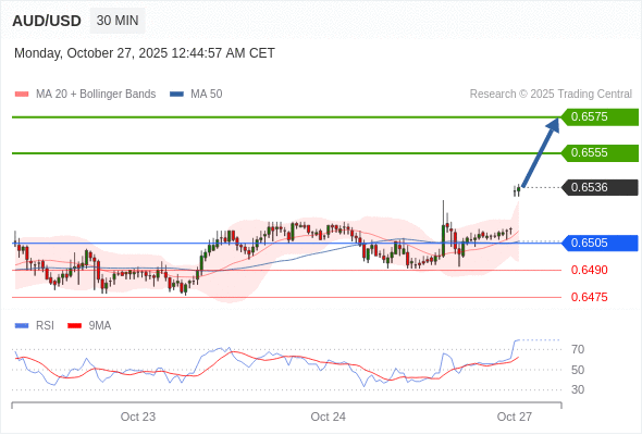 在 0.6505 之上,看涨,目标价位为 0.6555 ,然后为 0.6575 。