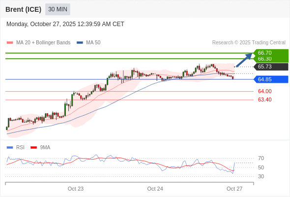 在 64.85 之上,看涨,目标价位为 66.30 ,然后为 66.70 。