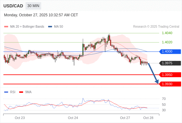 在 1.4000 之下,看跌,目标价位为 1.3950 ,然后为 1.3930 。