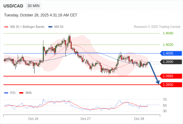 在 1.4005 之下,看跌,目标价位为 1.3965 ,然后为 1.3950 。