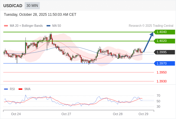 在 1.3970 之上,看涨,目标价位为 1.4020 ,然后为 1.4040 。