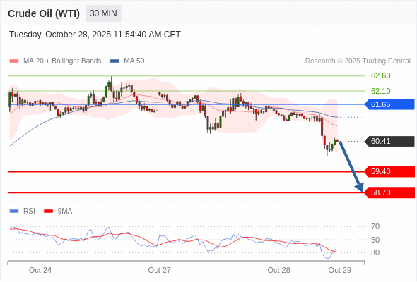 在 61.65 之下,看跌,目标价位为 59.40 ,然后为 58.70 。
