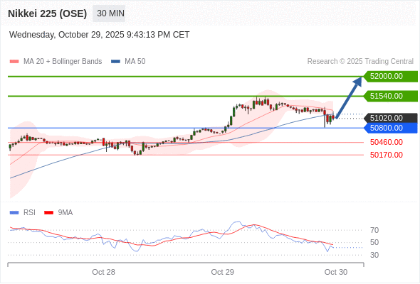 日经225股指期货 (OSE) 当日内: 在50800.00之上,看涨。