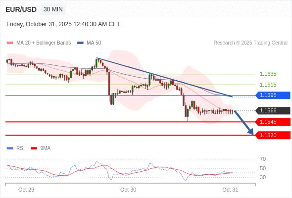 交易策略: 在 1.1595 之下,看跌,目标价位为 1.1545 ,然后为 1.1520 。