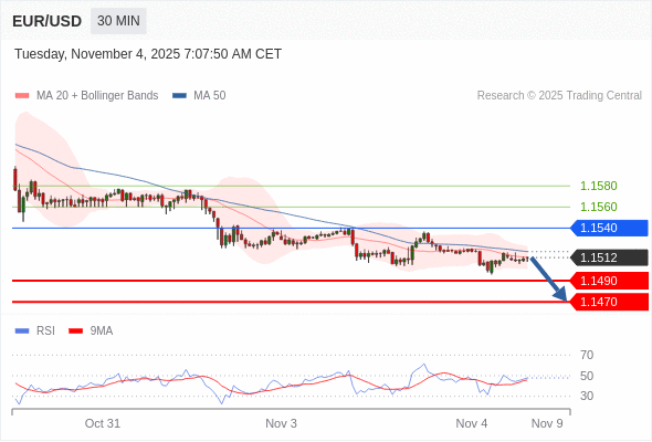 在 1.1540 之下,看跌,目标价位为 1.1490 ,然后为 1.1470 。