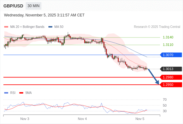 在 1.3070 之下,看跌,目标价位为 1.2980 ,然后为 1.2950 。