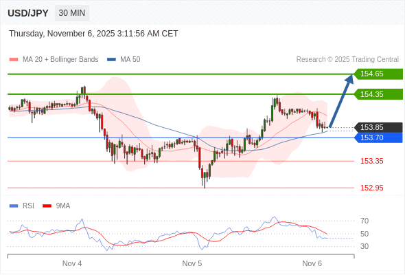 在 153.70 之上,看涨,目标价位为 154.35 ,然后为 154.65 。