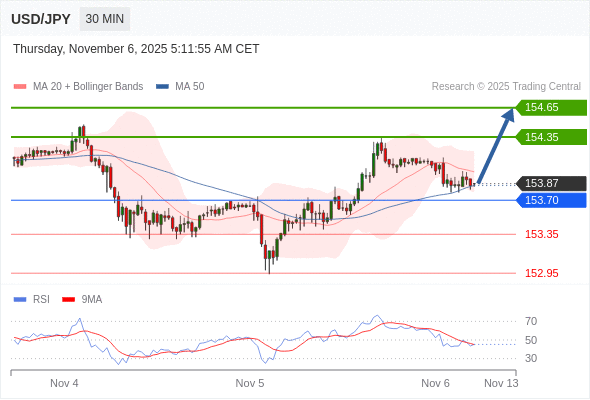 在 153.70 之上,看涨,目标价位为 154.35 ,然后为 154.65 。