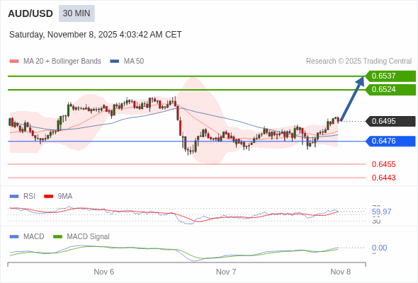澳元/美元 当日内 : 看涨,当 0.6476 为支撑位。