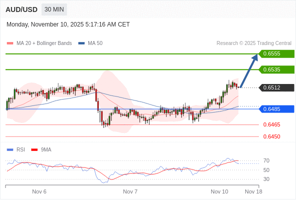 在 0.6485 之上,看涨,目标价位为 0.6535 ,然后为 0.6555 。