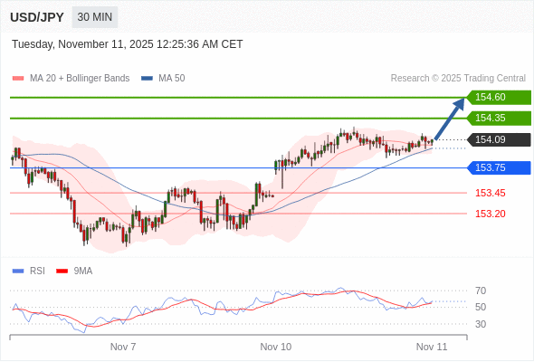 在 153.75 之上,看涨,目标价位为 154.35 ,然后为 154.60 。