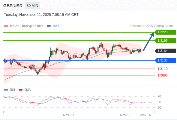 在 1.3135 之上,看涨,目标价位为 1.3195 ,然后为 1.3220 。