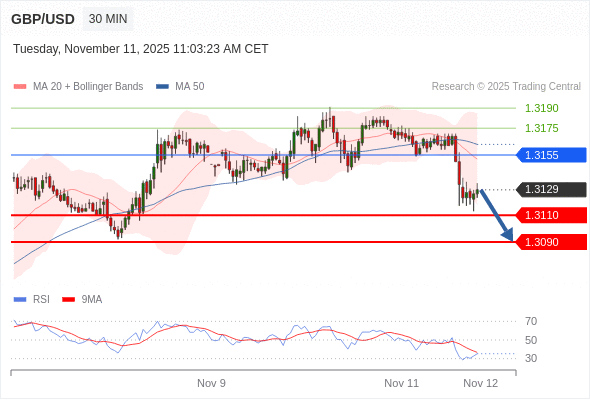 在 1.3155 之下,看跌,目标价位为 1.3110 ,然后为 1.3090 。