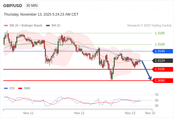 在 1.3145 之下,看跌,目标价位为 1.3105 ,然后为 1.3080 。