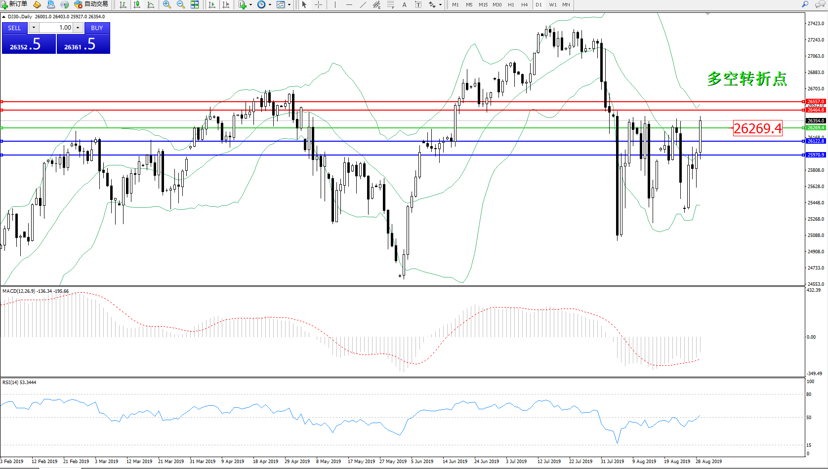 道琼斯指数8月29日(周四)收盘上涨326.20点,涨幅1.25%,报26362.25点。市场密切关注全球贸易局势发展及美国经济数据。美国经济第二季度增长放缓程度大于预期,因出口和库存等类别的数据较弱。尽管如此,消费者支出依然强劲,高于预期水平。关于贸易的利好消息让投资者希望重新回到一些股票市场,冒险意愿有所增强,对于GDP数据,虽然第二季度初值略有回落,但消费仍然看起来很强劲。这是关键。业绩方面也非常好,企业利润看起来很不错。