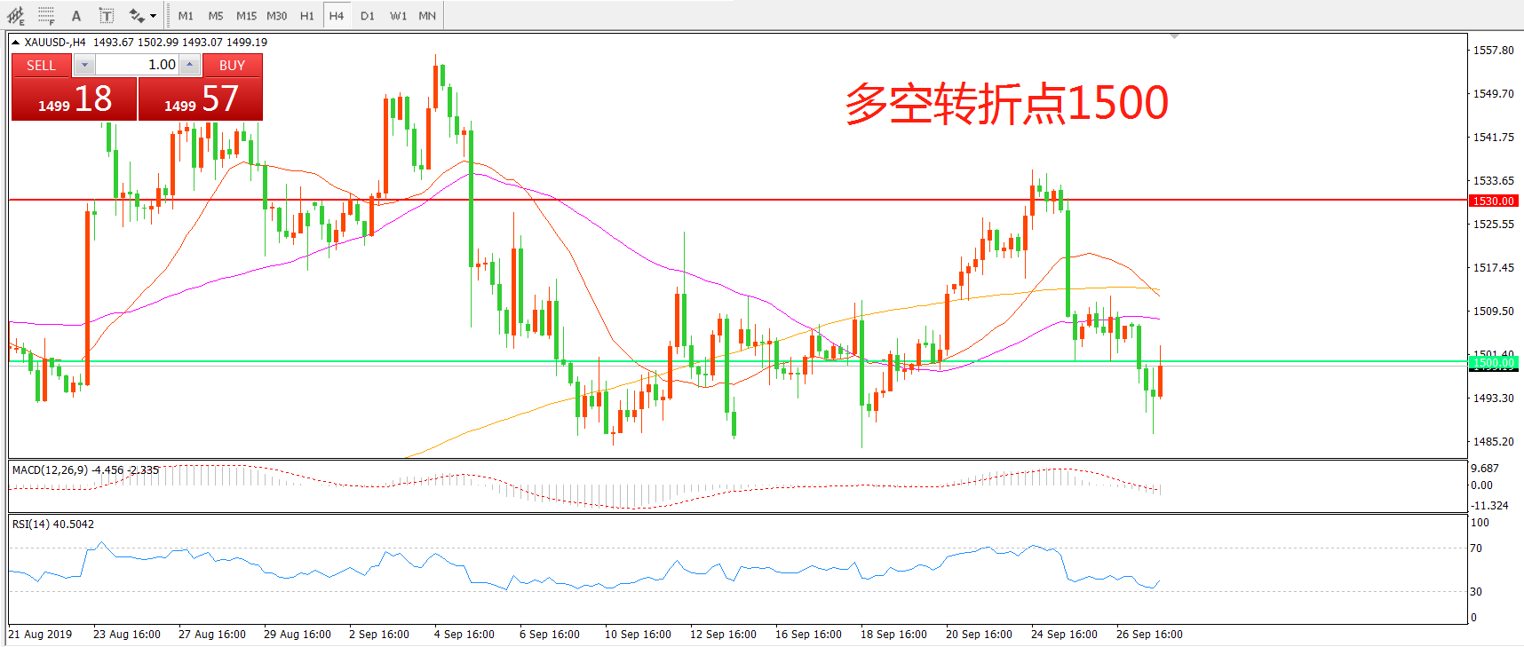 周五(9月27日)现货金价自日内低位反弹回升,最终收报1499.18美元/盎司,但金价内整体依然维持疲弱态势。美联储多位官员的讲话偏向鹰派,在沙特和也门达成停火协议后,市场避险需求进一步降温,金价失守1500整数关口,而市场英国硬脱欧和全球经济放缓的担忧情绪则在中期为金价提供支撑。