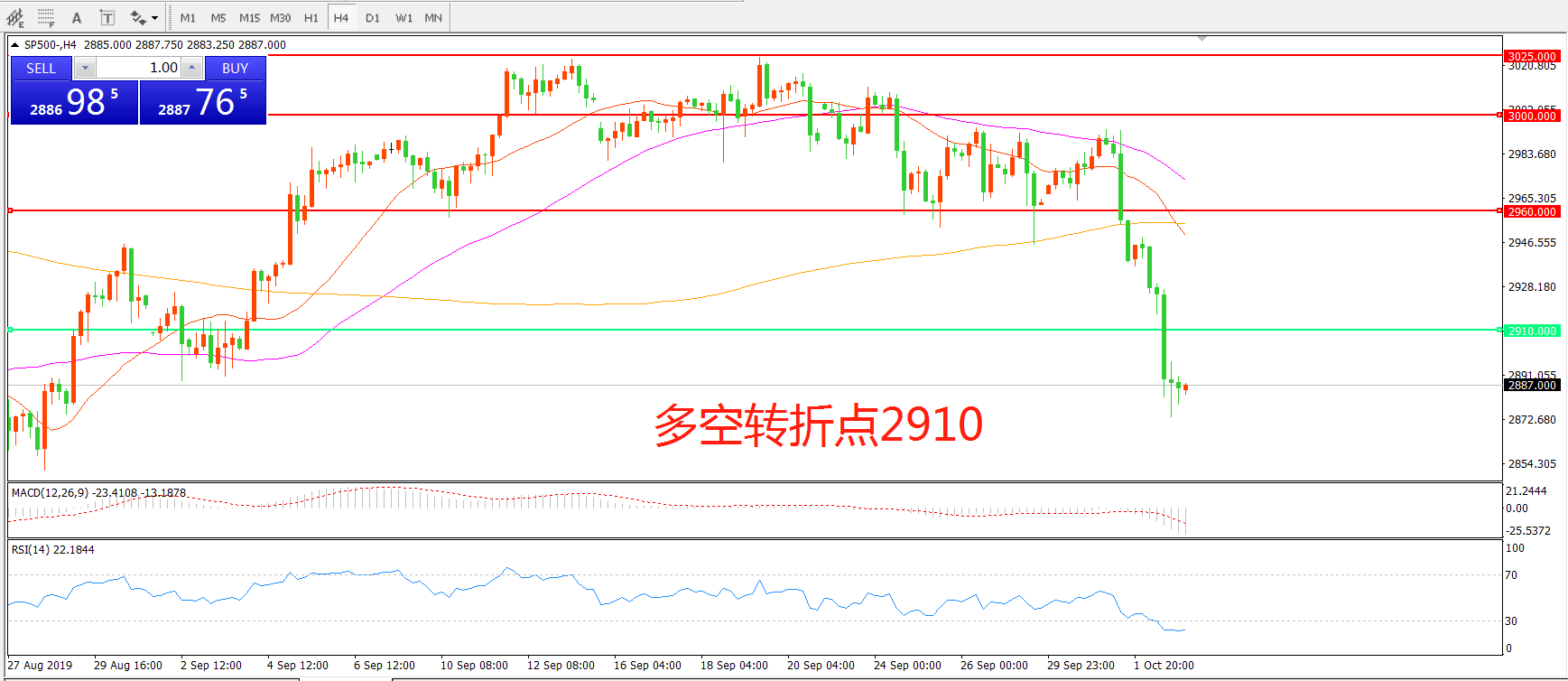 4小时图看,标普500长阴下破,整体走势偏弱,均线系统拐头向下,MACD绿柱增加,RSI指标拐头走平,日内延续下行较大。