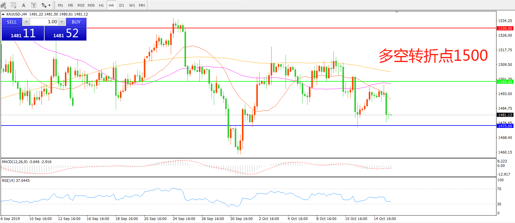 周二(10月15日),虽然IMF再度下调了全球经济增速预期,但有消息称,欧盟和英国之间的磋商接近达成脱欧协议草案,英国脱欧前景的利好点燃了市场的乐观情绪,金价承压下挫,收报1480.92美元/盎司,但本周的重点依然是周四和周五的欧盟峰会,务必重点关注。