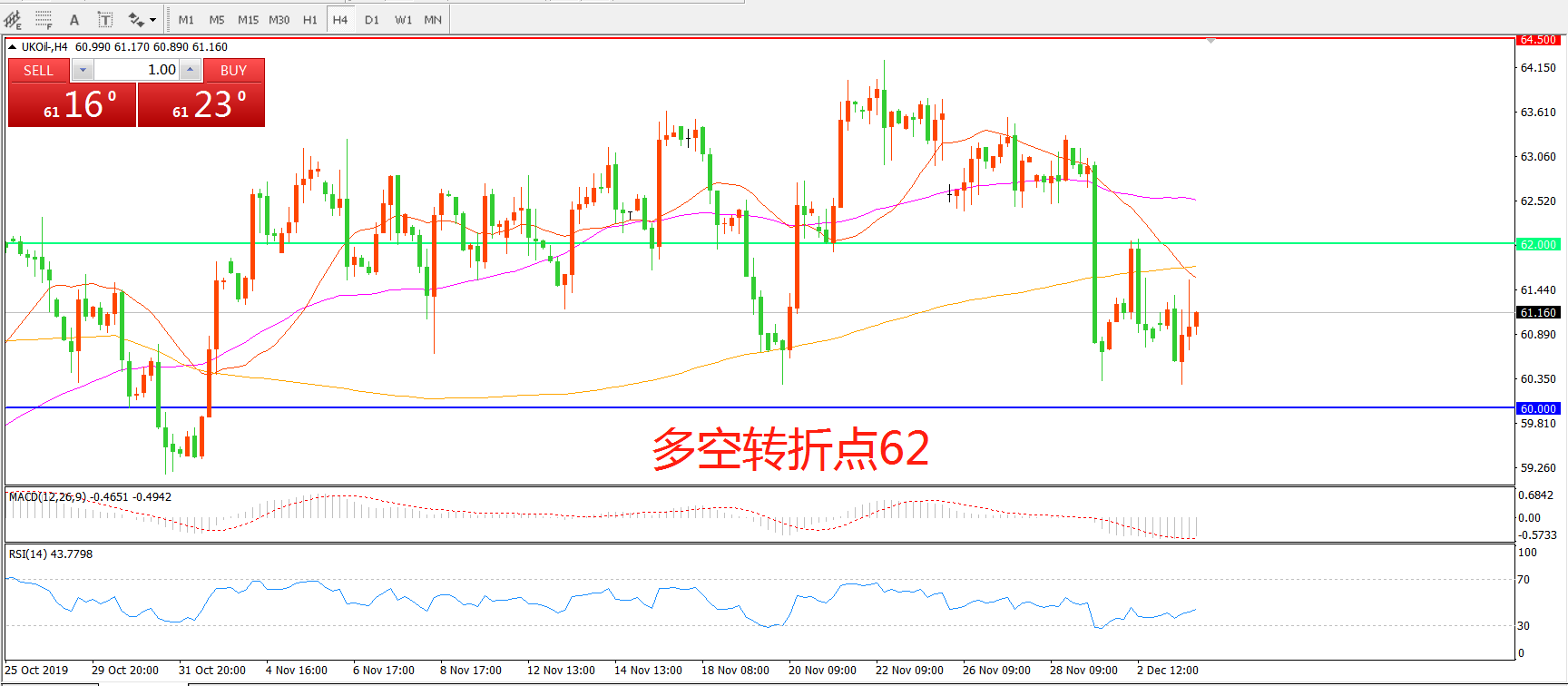 交易策略:在62.00之下看跌,目标60.00    57.50