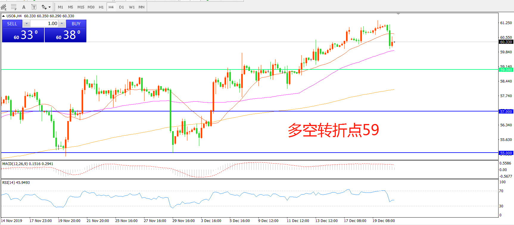 上周,由于国际贸易局势的持续向好,美股屡创历史记录新高,风险情绪的提振改善了原油的需求前景,,美原油一度创三个月新高至61.40美元/桶,但由于贝克休斯数据录得近二十个月最大单周增幅这暗示此前钻机数据下降的趋势可能结束;如果接下来的钻机数据继续增加,将会令市场担忧对美国会增加原油产量,美油上演高台跳水,收报60.33美元/桶,本周恰逢西方圣诞节,欧美多数国家将迎来假期,多数交易员会延续休假,预计市场整体交投较为清淡。