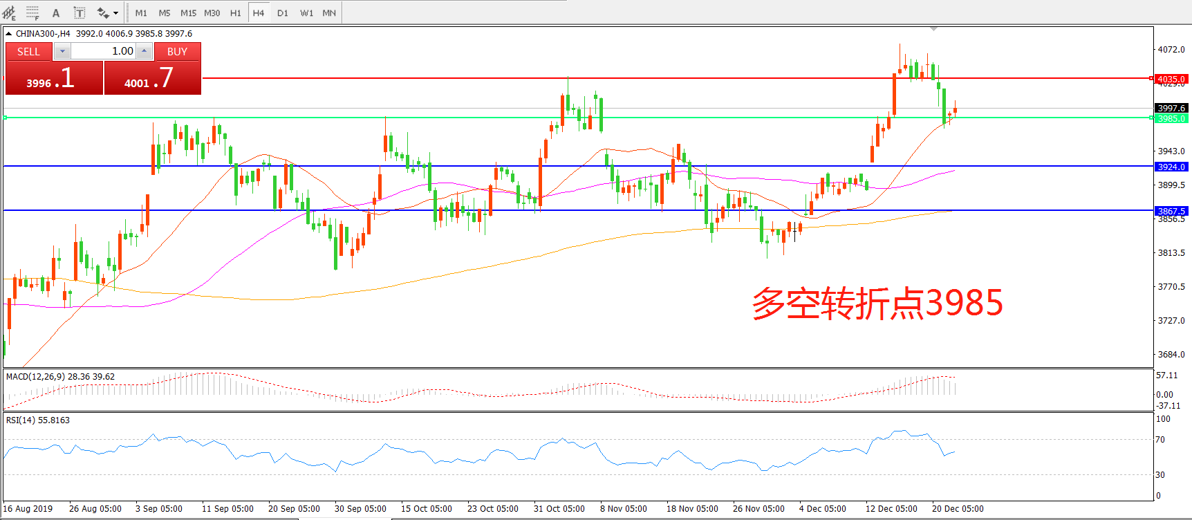 4小时图看,沪深300长阴下破后小幅反弹,短期看有回暖迹象,21周期均线成为短线支撑,MACD红柱减少,RSI指标向下,日内延续震荡概率较大。