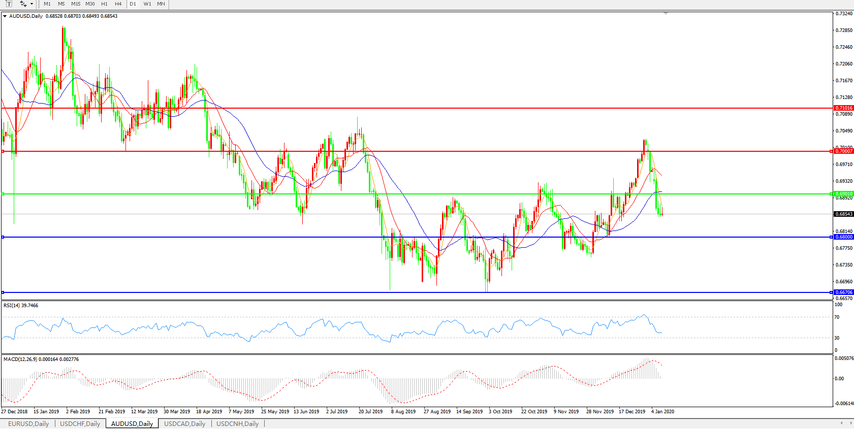 澳元汇价在此前因多方利空因素交加而持续重挫,虽然市场风险情绪在周四日内全线好转,但澳元却仍未录得像样的反弹,在进入欧洲时段之后更是因为美元指数的回升而再度走弱,跑输G10货币,原因在于澳洲自己的经济问题成了澳元反弹道路上的拦路虎; 在澳洲此前经济总体表现已经低迷的背景下,澳洲连日蔓延的森林大火更令该国多领域的经济活动遭遇严重打击,这使得澳洲联储2月份再度降息的概率从此前的接近零飙升到了当前的49.9%,几乎达到半数,并且年内还可能有进一步的宽松举行,这更令澳元汇价首当其冲; 在此种状况下,澳元短线重入下行趋势已无悬念,下方关键支撑在100日均线切入位0.6829,失守后则意味着过去两年来波浪式下行的持续通道将再度被接续。