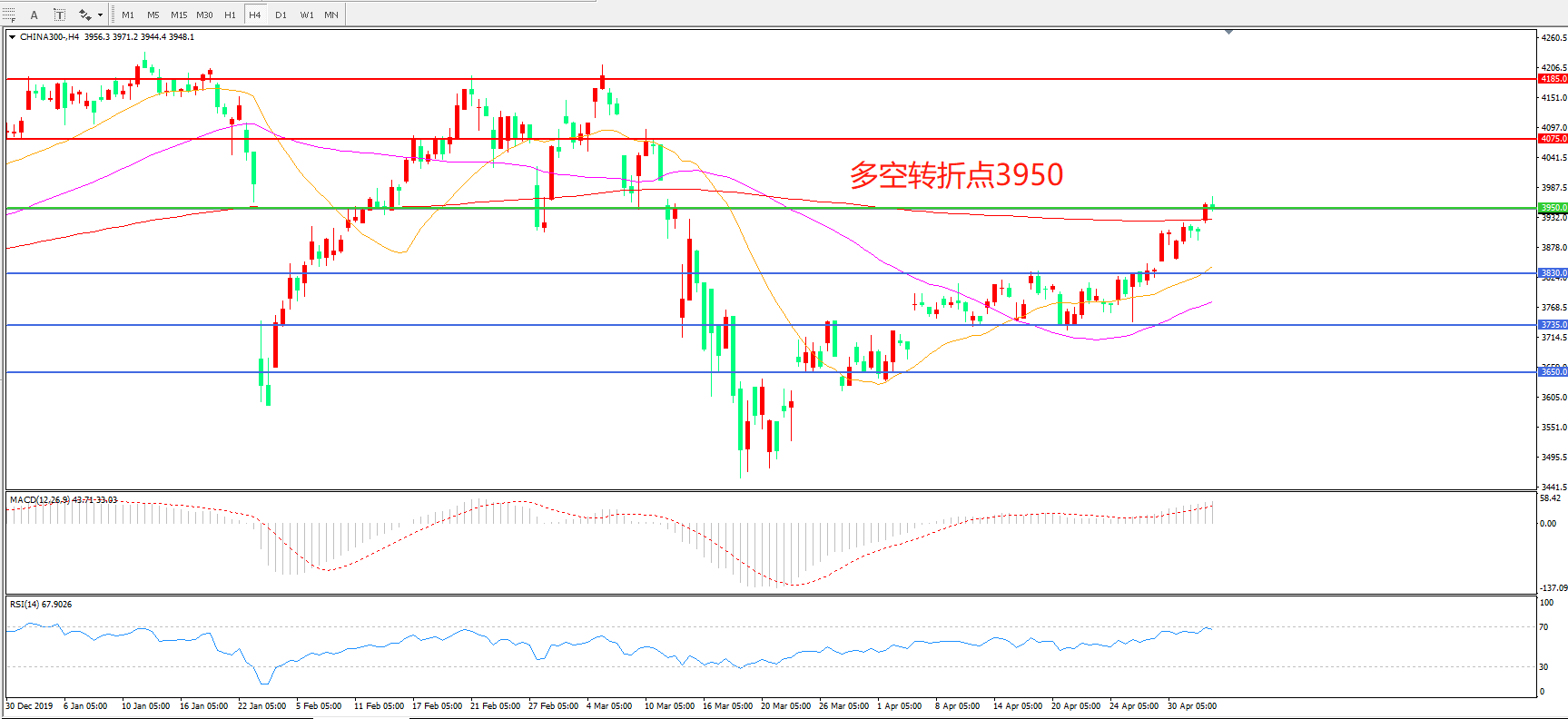 4小时图看,沪深300震荡上行,突破前期整理区间,短期走势偏强,200周期均线成为下方支撑,短期均线拐头向上,MACD红柱增加,RSI指标走平,日内延续上行概率较大。