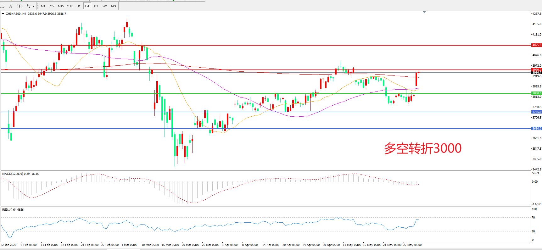 4小时图看,沪深300跳空高开并收出光头光脚阳线,整体走势偏强,3950成为短期阻力,均线系统走平,MACD绿柱减少,RSI指标走平,日内延续上行概率较大。