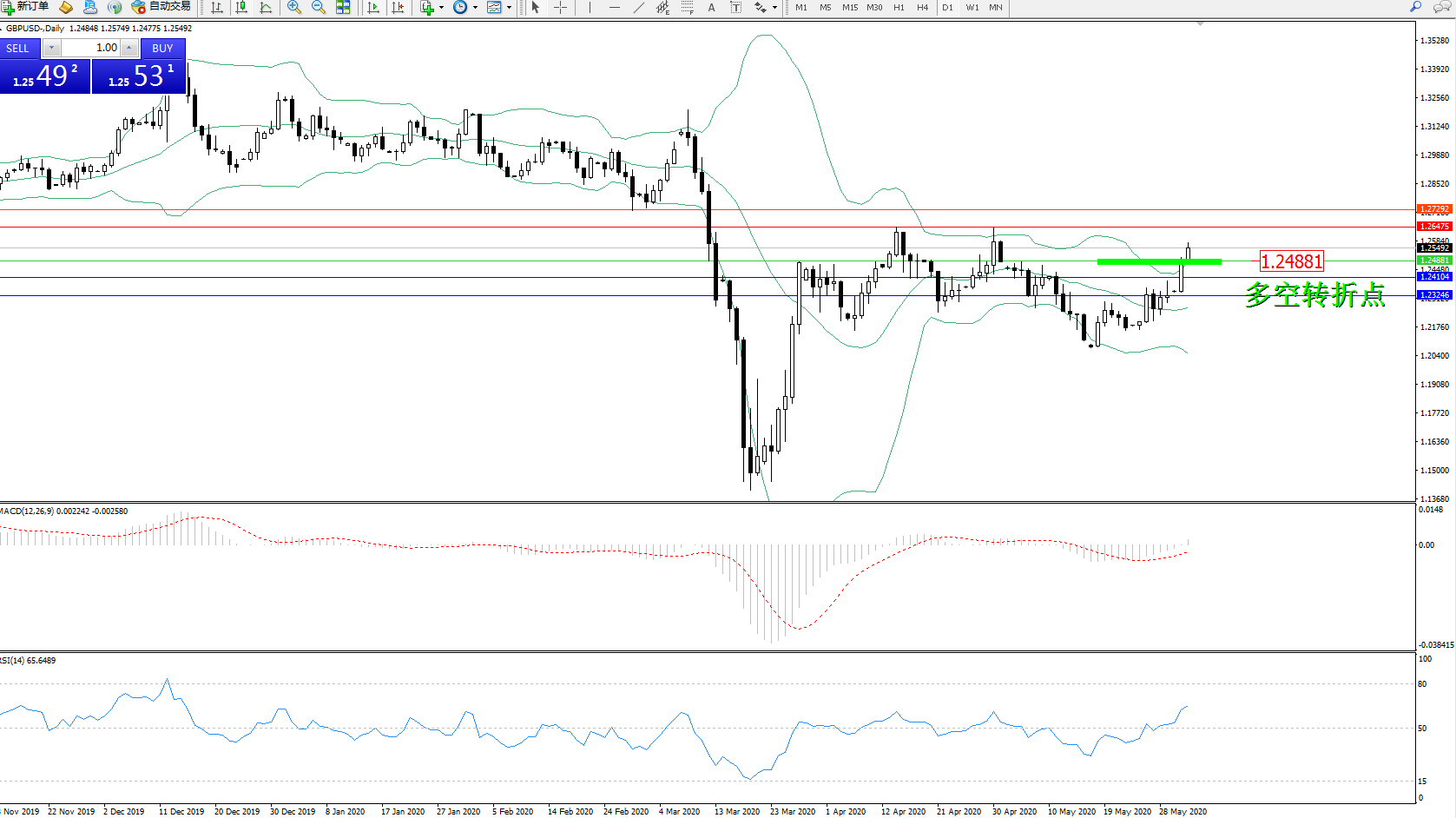 交易策略:1.24881上方看涨,目标1.26475、1.27292