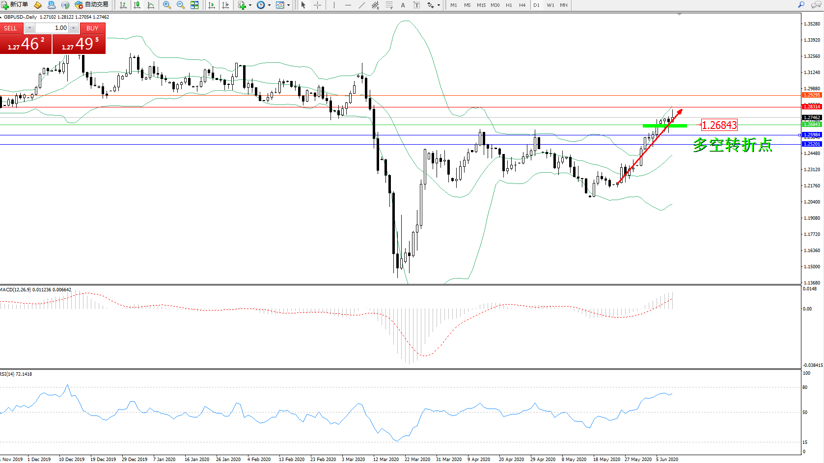 交易策略:1.26843上方看涨,目标1.28314、1.29295