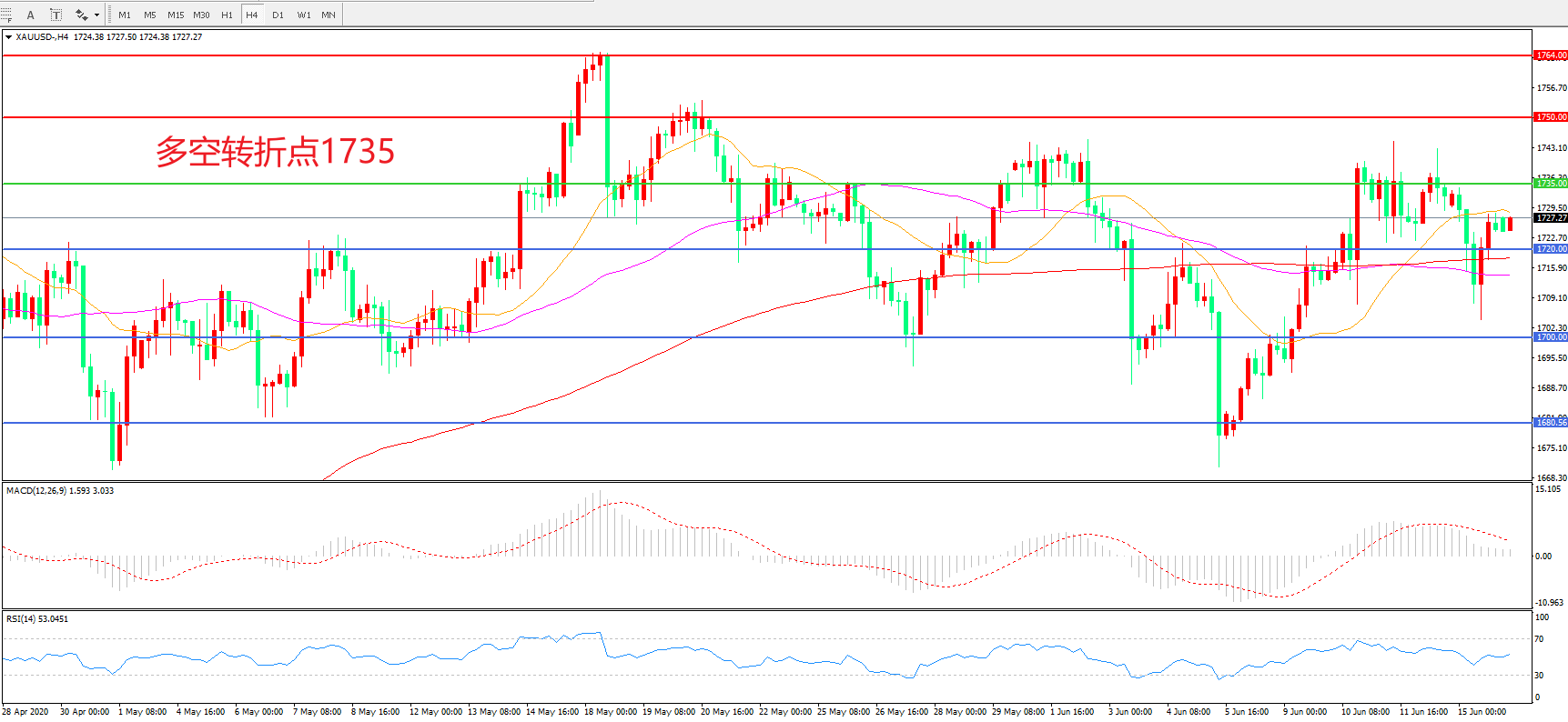 周一(6月15日),市场面对新冠疫情可能二次爆发的可能而惊慌失措,美股一度大跌,随后在美联储的支持下反弹修复,而金价则呈现宽幅震荡走势,最终收报1724.60美元/盎司。金价低迷表明了短期内投资者对疫情二次爆发的不安情绪,但美元未能像3月份金融市场暴跌期间那样上涨,流动性危机过后,避险依然会是市场上的主基调。