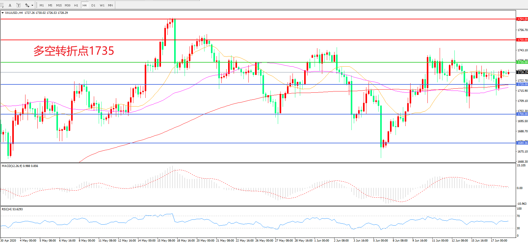 周三(6月17日),地缘政治紧张局势频发,引发新一轮担忧,金价维持高位震荡,收报1727.69美元/盎司,日内虽有鲍威尔登场亮相,但乏善可陈的内容并未引发市场足够的波动。黄金多头一度尝试发力,但在1735附近的高位依然有着较强的阻力,好在下方的支撑目前也比较完好,尤其是1710附近还是有不错的承接力度。
