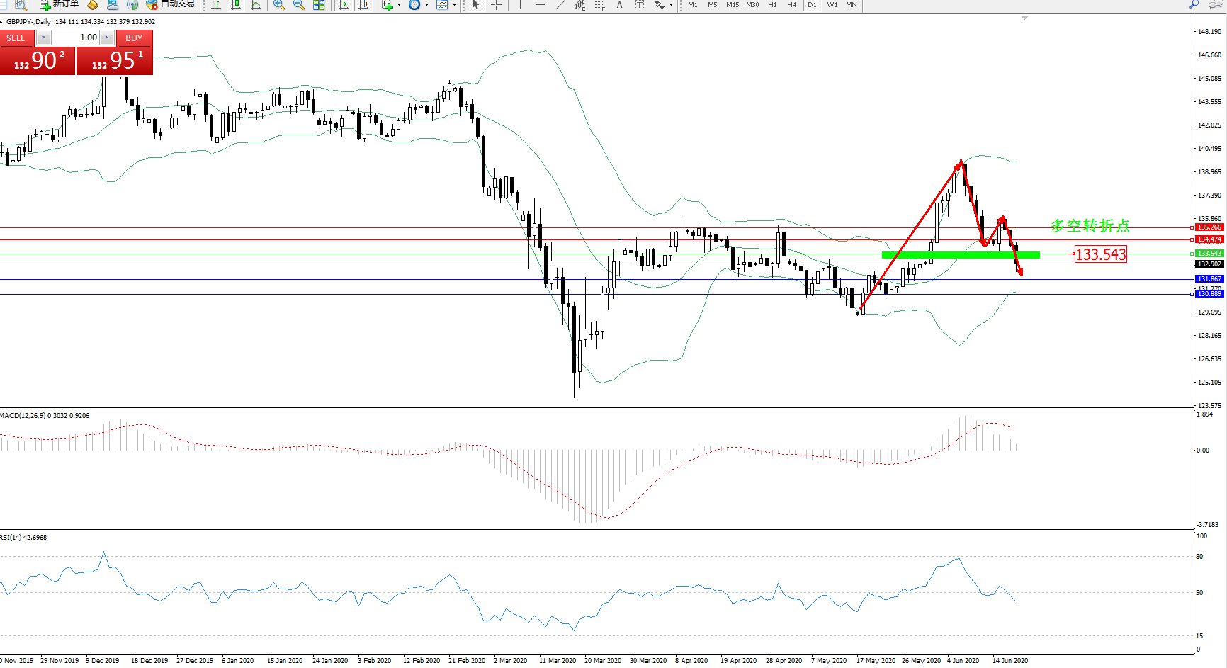 交易策略:133.543下方看跌,目标131.867130.889