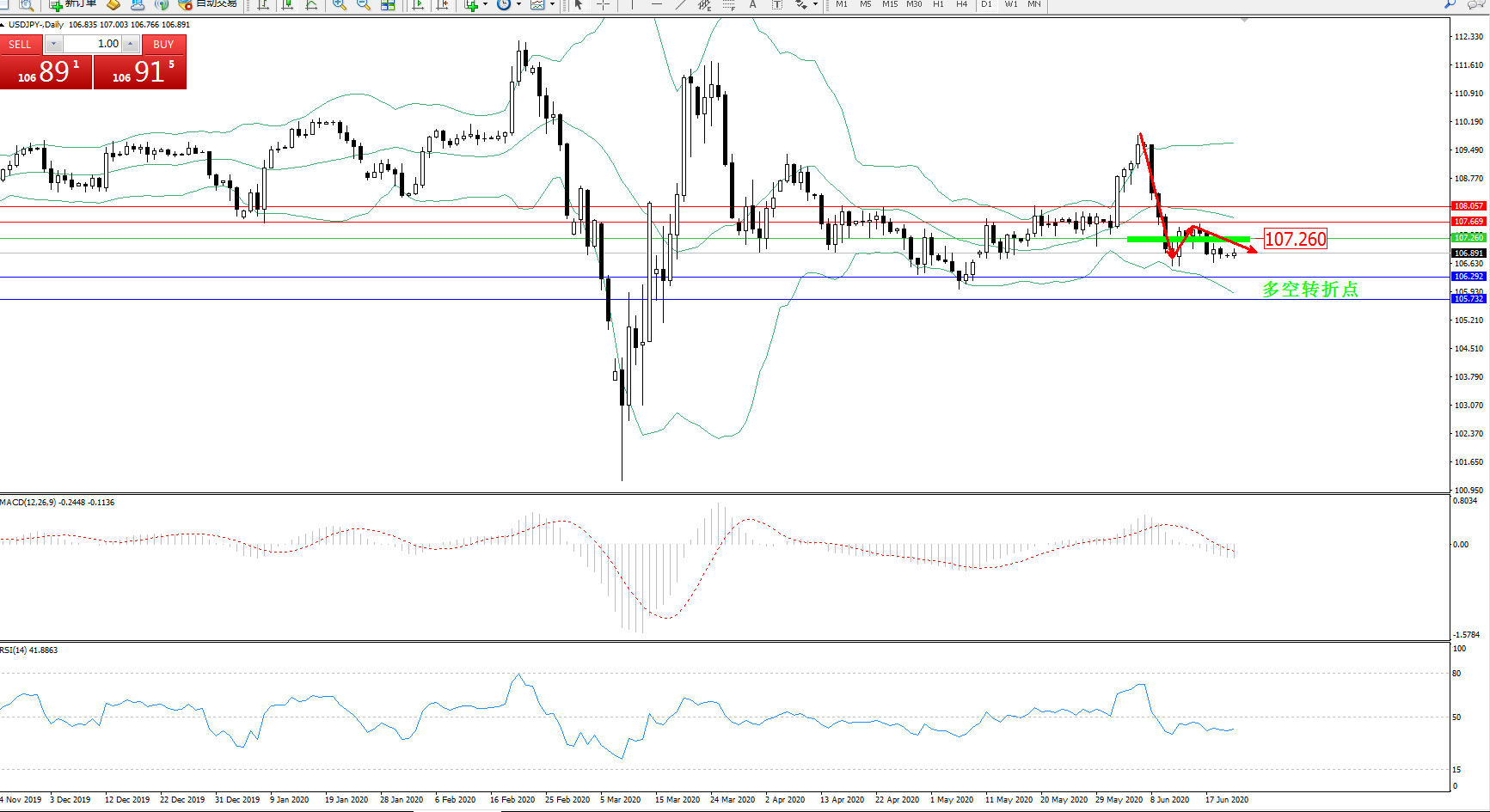 美元兑日元陷入震荡,交投于106.9附近,日内风险偏好情绪略有起伏,投资者对二次疫情爆发存担忧情绪,同时投资者也继续押注风险资产走高,同时地缘局势方面也有所缓和,因此日元短期并无太多趋势。日本政府日内发布的经济评估报告意外向好,但仍无法彻底平复全球市场的担忧情绪;日本政府经济展望报告自2018年以来首次上调了经济预估,称疫情对该国的影响已经逐渐淡出,经济活动水平已经触底。大家对包括日本本国在内的全球经济现况也充满担忧。这再结合上周以来国际地缘局势出现的新变数,足以令日元避险买需继续维系。