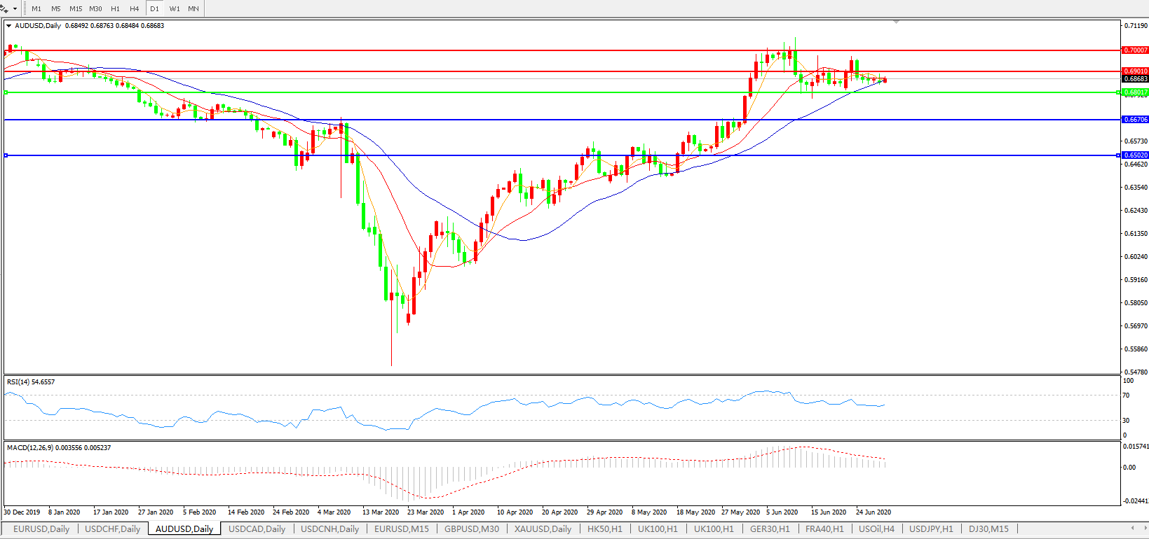 交易策略:0.6800上方看涨,目标0.6900、0.7000