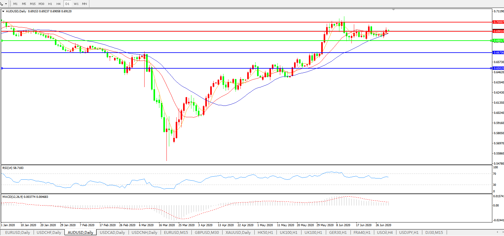 技术面简析:日图短期均线高位粘合走平,汇价持续窄幅整理略显强势,MACD运行于0轴上方且量能持续缩量,RSI有走升迹象,预计汇价短线大概率将继续整理,关注0.6800关口支撑。