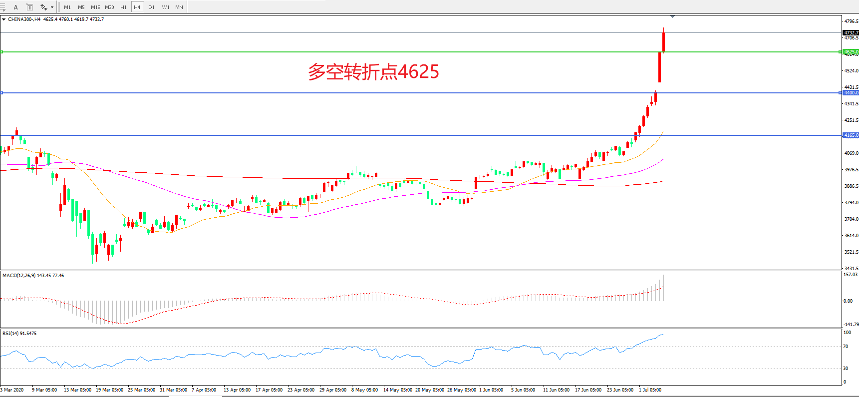4小时图看,沪深300跳空高开,长阳连续拉升,表现极度强势,均线系统呈多头排列, MACD红柱增加,RSI指标向上,日内延续上行概率较大。