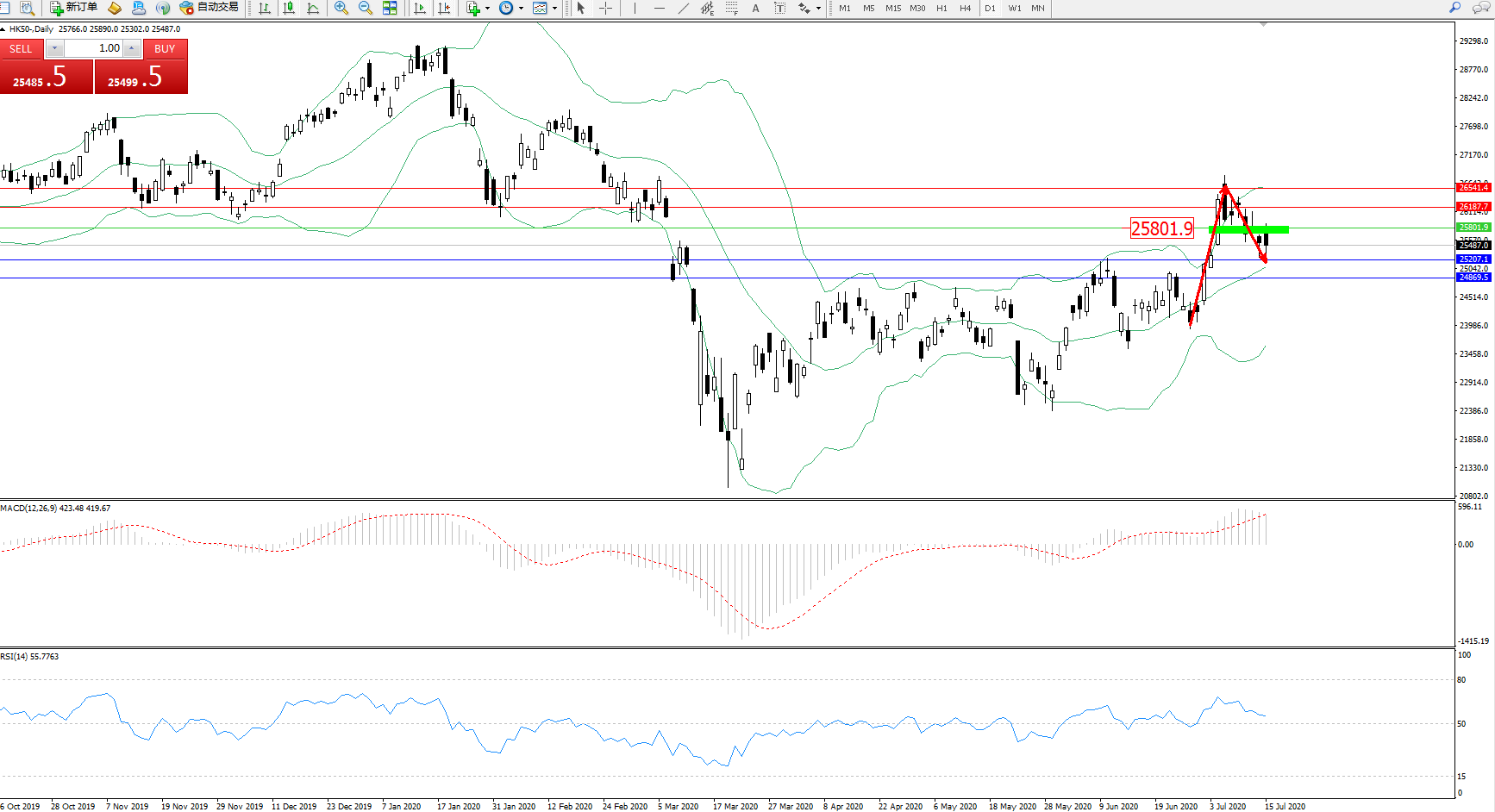 香港恒生指数715日(周三)收盘上涨3.69点,涨幅0.01%,报25481.58点;港股三大指数高开低走,国指跌0.14%10390点。盘面上,半导体、手机概念股大跌居前,中芯国际大跌8%,部分航空股造好,美兰空港飙升超21%;腾讯大涨3.43%力撑大市,贡献恒指上百点。今日南下资金净流入39.03亿港元,大市成交额为1641亿港元。新型肺炎重创香港零售市,仲量联行进一步下调今年街铺租金预测,由去年底预期的最多跌20%,大幅下调到跌35%至40%。其中上半年尖沙咀区租金大跌三成,加上近期疫情反覆,零售商对恢复通关时间表仍存疑。香港特区政府政务司司长张建宗15日表示,粤港澳三地政府互认“健康码”差不多已经完成商讨,由于香港目前疫情相当严峻,所以有关安排将在疫情稳定后进一步推动。