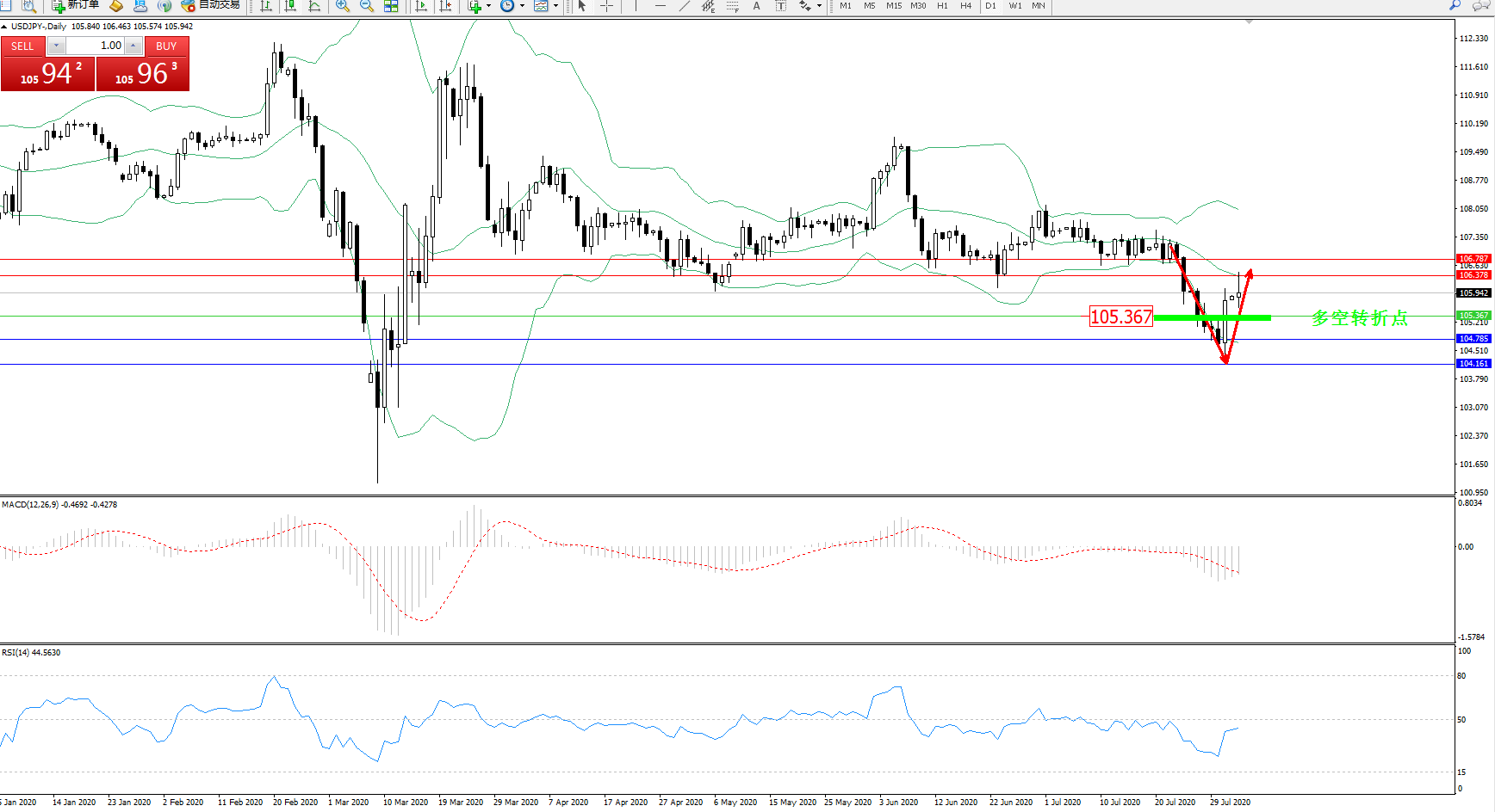 技术点评:高位空头动力延续布林带指标下轨持续弱势下行数日后,低位抵达104.161附近出现快速回升态势,拉升前期部分涨势,触及布林带指标中轨附近节点后维持整理,布林带指标呈张口走势后以后收口迹象,MACD指标处于0轴线下方空头区域弱势整理震荡下移后开始平移,RSI指标处于空头动力持续震荡下移后出现快速拉升走势;