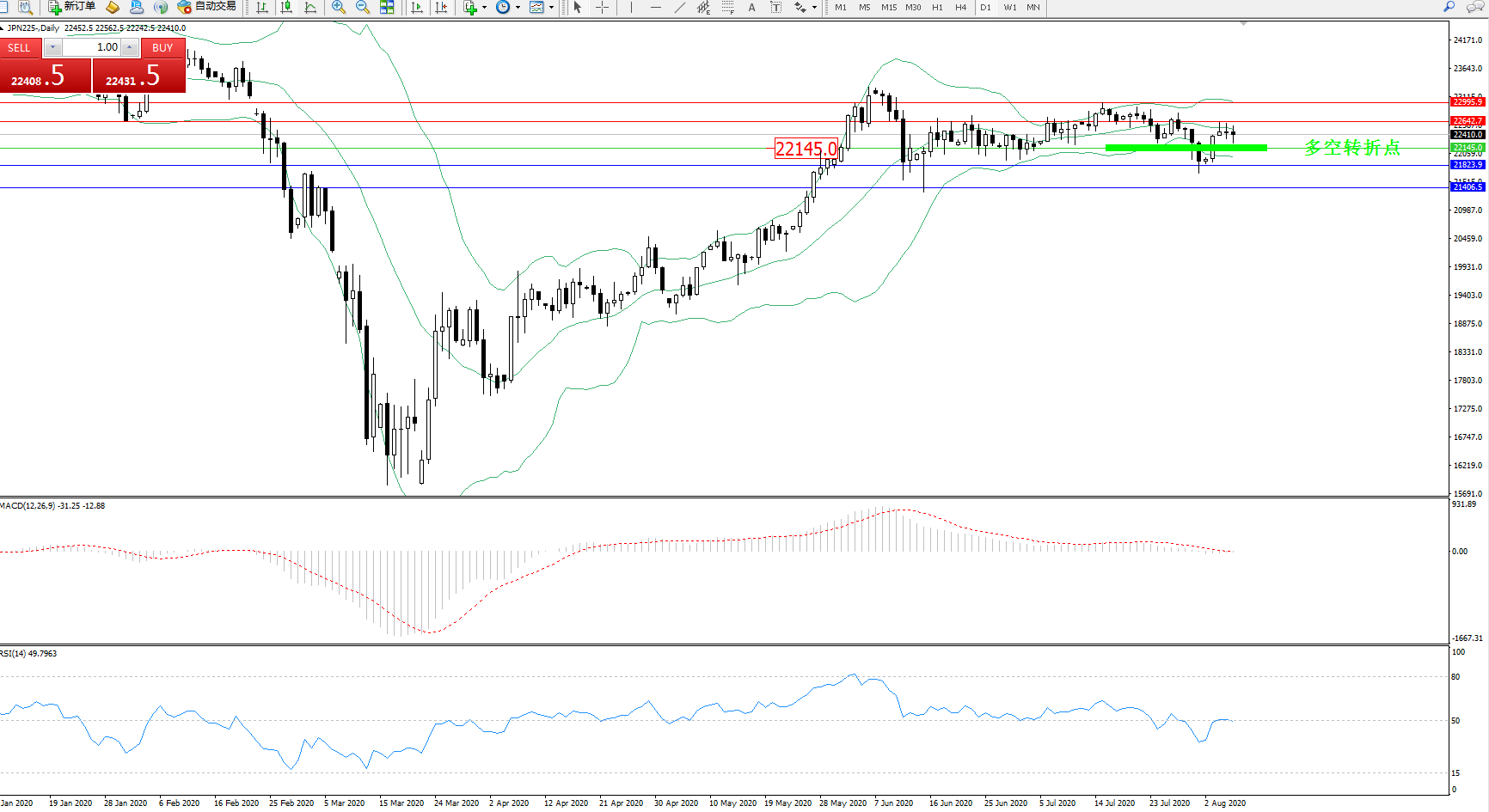 日经225指数8月6日(周四)收盘下跌121.85点,跌幅0.54%,报22393.00点。日本首相安倍晋三表示当前暂时无需重启全国性紧急状态措施。日本央行行长黑田东彦警告称,如果恢复严格的公共卫生措施,以防止冠状病毒大流行的进一步蔓延,经济活动可能会再次“严重”受限。日本并没有陷入通缩,央行将继续努力实现遥不可及的2%通胀目标。 并没有陷入通货紧缩,即物价在一段时期持续下滑。肯定比预期的要花更多时间,但确信将实现目标。日本央行准备在必要时"毫不犹豫地"加大货币刺激力度,以抗击疫情对经济的冲击。,尽管存在极大的不确定性,但日本和海外经济可能会从今年下半年开始逐渐好转,但由于(遏制病毒的)预防措施将限制经济活动,预计改善的步伐将是缓慢的。